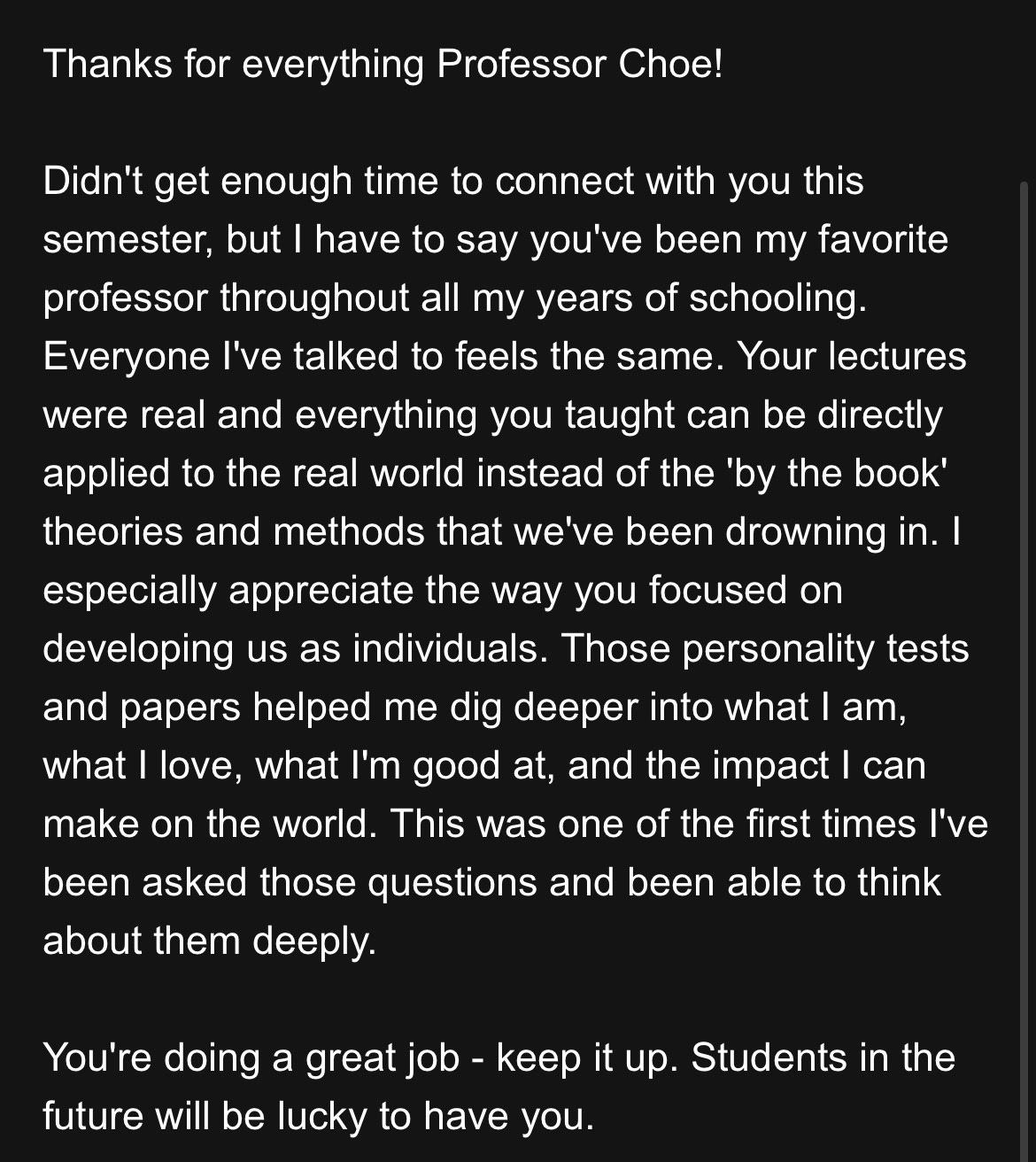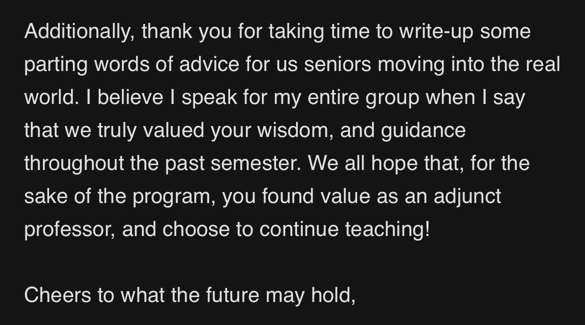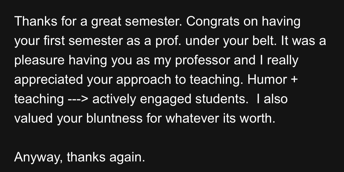 To maintain relevance in course material I still found myself doing research ahead of time to make sure I wasn’t talking about shit that wasn’t relevant. This is so time-consuming and quite honestly where it probably separates okay professors from good professors and good professors from great professors.